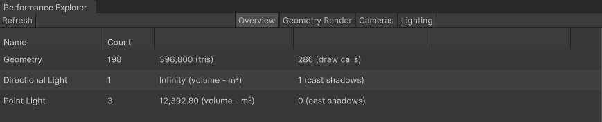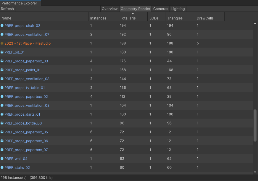 The Geometry Render tab displays information about objects in your room, including Maker Pen Objects. Instances, total tris, LODs, draw calls and triangles. Instance is the number of times that object is used in your subroom. Tris and draw calls are important to reduce on objects with a large amount, or if they have many instances. If you find performance issues in your room with noticeably low framerate, reducing the Tris of meshes by editing it in a 3D sculpting program like Blender can help.